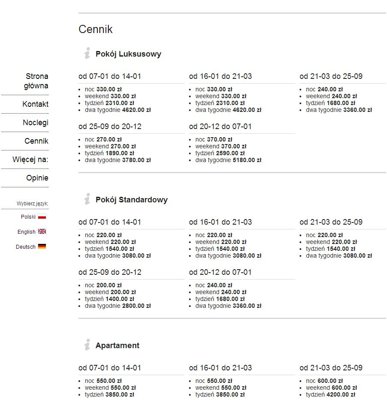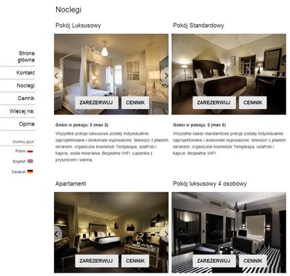 - Możliwość łatwego przeglądania opisów, cen noclegów i zdjęć pokojów dla Gości